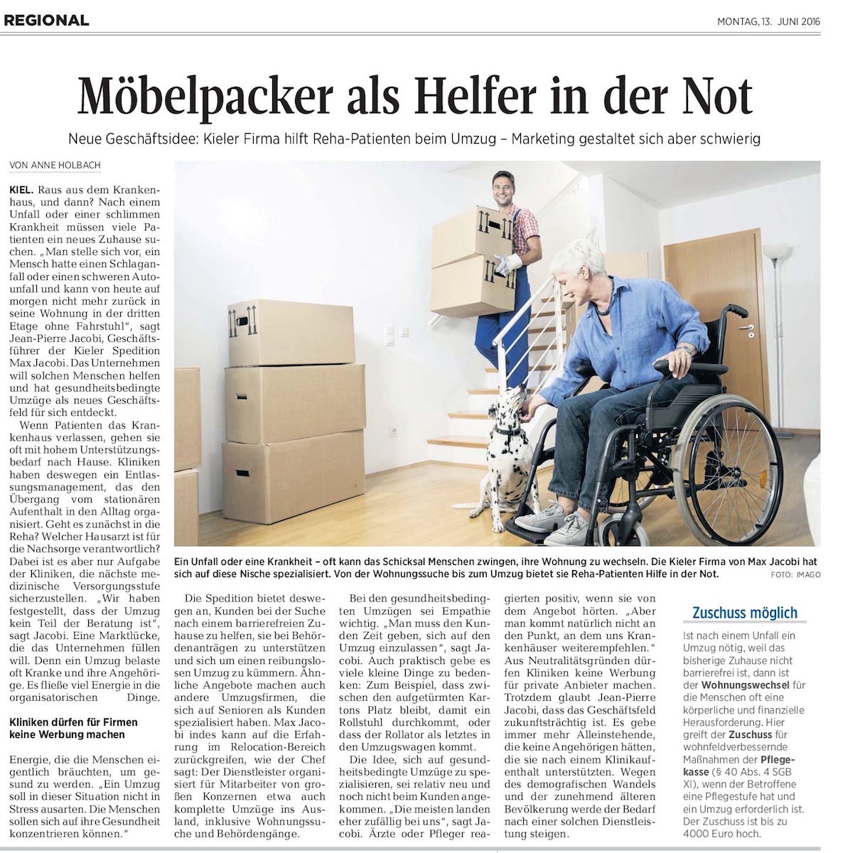 Unser Geschäftsführer Herr Jean-Pierre Jacobi hatte im Januar diesen Jahres einen Vortrag über unsere gesundheitsbedingten Umzügen auf dem Kongress „Vernetzte Gesundheit“ in Kiel gehalten. Dieser Vortrag hatte nicht nur das Interesse der Zuhörerschaft aus der Fachwelt der Gesundheitsbranche geweckt sondern hatte auch die Kieler Nachrichten dazu motiviert einen Artikel über dieses Thema zu verfassen.